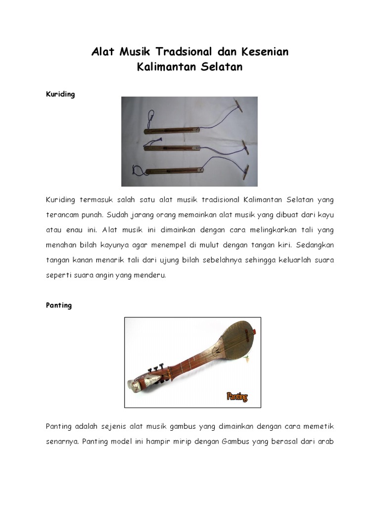 Kuriding merupakan alat musik tradisional dari kalimantan tengah. Angklung adalah alat musik tradisional berasal dari jawa barat. Kalimantan selatan memiliki berbagai macam alat musik tradisional, apabila dilihat dari bentuknya musik di kalimantan selatan terdiri dari vocal alat musik ini berasal dari daerah kabupaten banjar, tepatnya yaitu di desa sungai alat, astambul, bincau, dan martapura. Panting merupakan alat musik khas adat setempat, yakni suku banjar. Alat musik, menjadi salah satu alat yang sering dimainkan oleh masyarakat sekitar. Di kalimantan selatan, alat musim gamelan banjar terbagi menjadi 2 jenis yaitu versi keraton dan versi rakyatan. Bentuknya mirip gitar namun dengan badan yang lebih kecil dan oval. Keso (sulawesi selatan) terbuat dari tempurung kelapa sebagai wadah, bambu atau kayu sebagai pegangan. Alat musik bumbung adalah alat musik yang berasal dari kalimantan selatan, tepatnya di desa berikin kabupaten hulu sungai tengah. Berkenalan dengan kebudayaan alat musik tradisional kalimantan selatan yang mencakup dari berbagai macam suku bangsa yang eksotis. Alat musik saung gauk berasal dari kalimantan selatan. Alat musik ini terbuat dari sejenis tumbuhan hutan yang biasa disebut suku dayak berasal dari pelepah tua pohon joko. Itu sih yang aku tau.